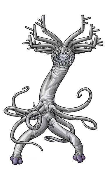 从我认为是树干的结构顶端升起了一个没有五官的卵状物体……顶端有个大张着的洞口。”