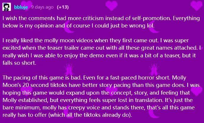 但一些要求严格的粉丝,显然对这简陋的质量很不满意,长篇大论地认真向开发者阐述将游戏看起来是如何毫无意义、不知所云,分析既然要做成游戏,就应该不应该像短视频那样省略大量细节。