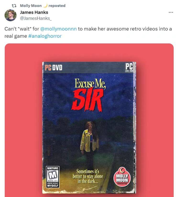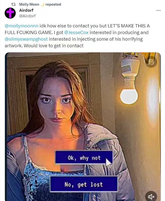 恐怖游戏Faith 的开发商Airdorf Games表现得相当积极。他们擅长制作8-bit 游戏,专攻过 cult类型,对Molly的创作灵感来电不足为奇。对方迅速在X上圈出Molly本人,希望能够与之合作——这当然不仅限于得到授权,还需要Molly本人出镜参与制作。而Molly当场欣然同意。