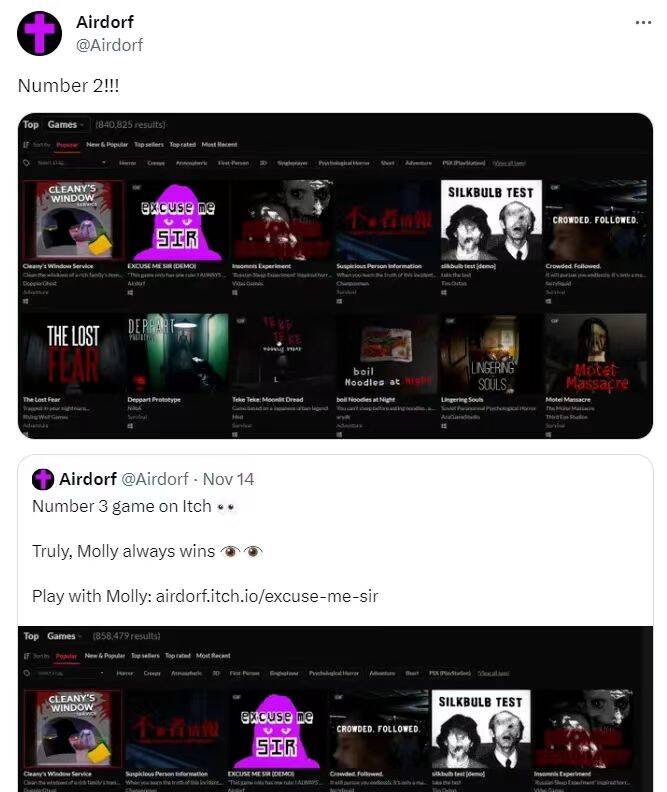 游戏发布后,迅速在itch.io的最受瞩目游戏中排名第二,受到了独立游戏爱好者们的关注。