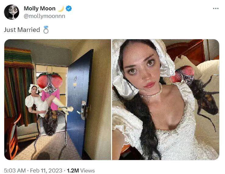 她在X的社交账号也逐渐担起辅助视频主题的作品——比如为了完善“把骗来的人献给巨大苍蝇”的剧情,她发布了自己和那只变异飞虫的“结婚照”。