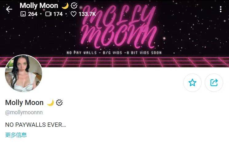 Molly主要在两个平台上奋斗,最早是某个黄黑色系网站,如今基本转向Onlyfans。除此之外,她在其他社交媒体更新都不算很勤快。