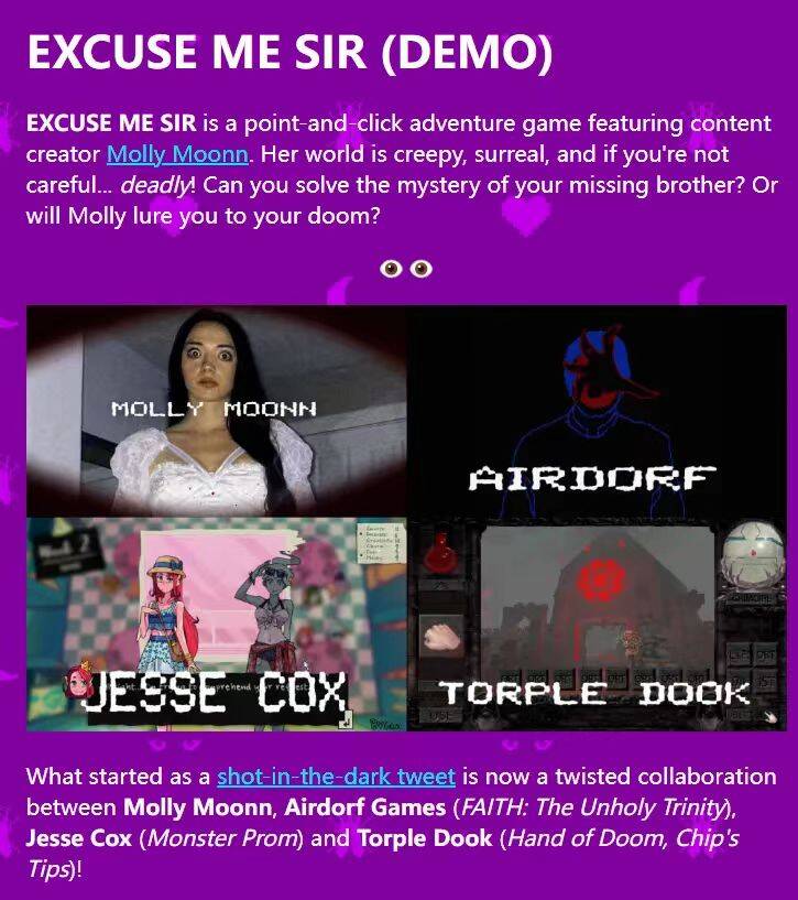 也不知道Airdorf Games开发者和Molly本人是否想到,还真有人对这样一个游戏报有如此高的期待。如此受关注,为游戏的itch.io页面带来了上百条评价,虽然尚且不知道《Excuse Me, Sir》到底会是怎样的游戏,但看起来玩家所提供的的建议,足够开发者们好好琢磨一阵子。
