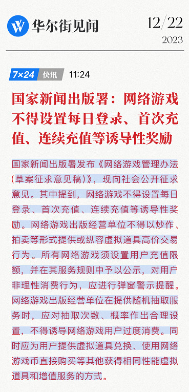 其中提到,网络游戏不得设置每日登录、首次充值、连续充值等诱导性奖励。网络游戏出版经营单位不得以炒作拍卖等形式提供或纵容虚拟道具高价交易行为。所有网络游戏须设置用户充值限额,并在其服务规则中予以公示,对用户非理性消费行为,应进行弹窗警示提醒网络游戏出版经营单位在提供随机抽取服务时,应对抽取次数、概率作出合理设置,不得诱导网络游戏用户过度消费。同时应为用户提供虚拟道具兑换、使用网络游戏币直接购买等其他获得相同性能虚拟道具和增值服务的方式。