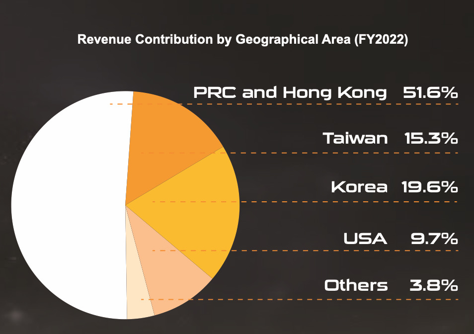 来自这两大巨头的订单,每年能占到公司收入的两至三成,也贡献了来自大陆及香港地区的收入的一大部分。在公司上个财年的收入中,大陆、香港、台湾三个地区的收入共计能占到约67%,看来汉语言区仍是公司的主要市场。