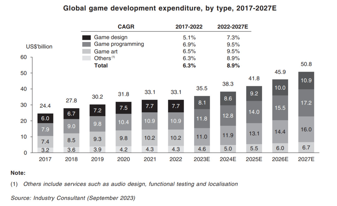 大额的美术外包费用,首先与控制成本有关,这在全球范围内都很常见。有报告显示,全球游戏行业的游戏开发支出已经从2017年的244亿美元增长到了2022年的331亿美元,2017年至2022年的复合年增长率为6.3%。其中,预计游戏编程和游戏美术相关的全球游戏开发支出在2022年至2027年间将呈现更高的复合年增长率,分别达到172亿美元和160亿美元。这种增长是由于程序员和游戏美术人员的劳动成本上升,以及生产更高质量游戏的需求。预计游戏行业全球总开发支出将在2027年增长至508亿美元,2022年至2027年的复合年增长率为8.9%。