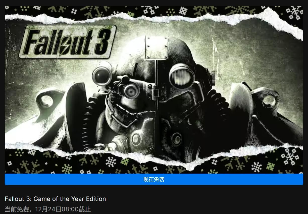 Epic连续16天第四天喜加一游戏已开放领取,今天免费提供的是Bethesda经典大作《辐射3》年度最佳游戏版,免费领取时间为12月24日0点至12月25日0点。感兴趣的玩家不要错过,明日继续神秘游戏。