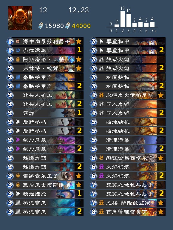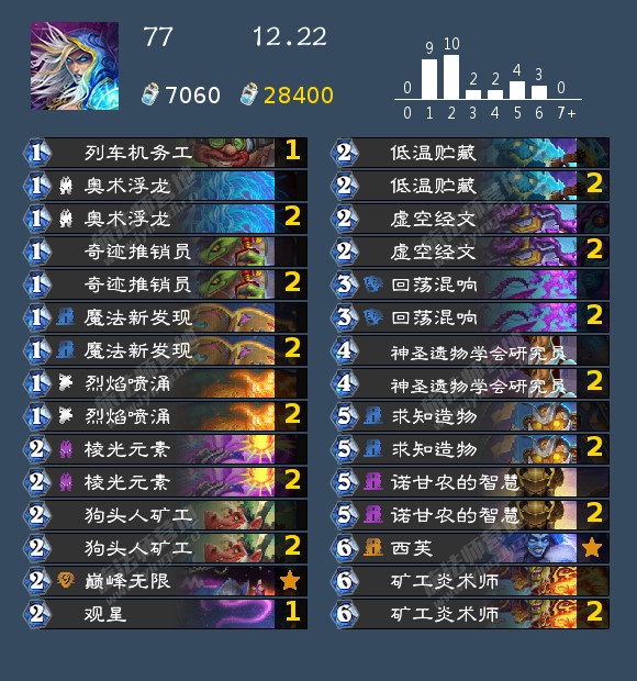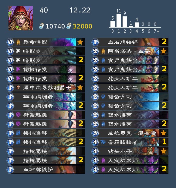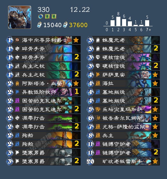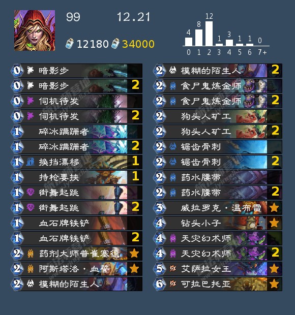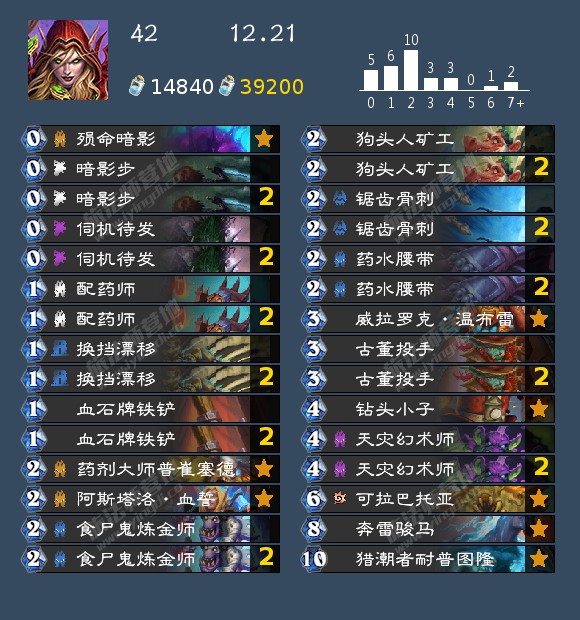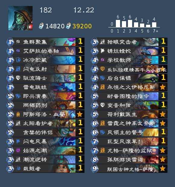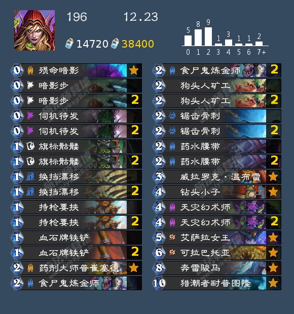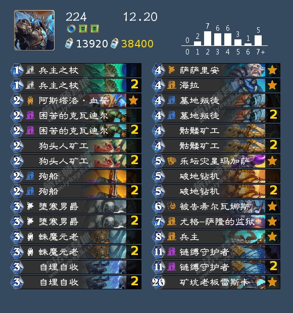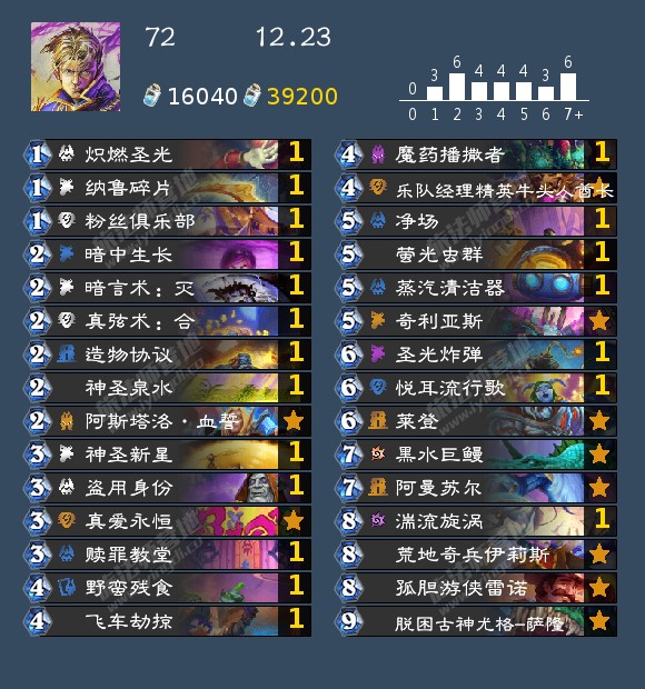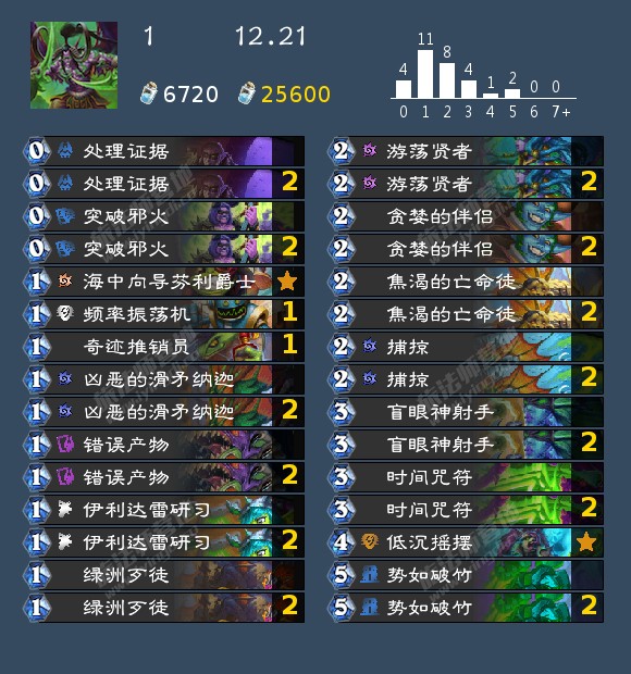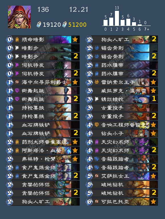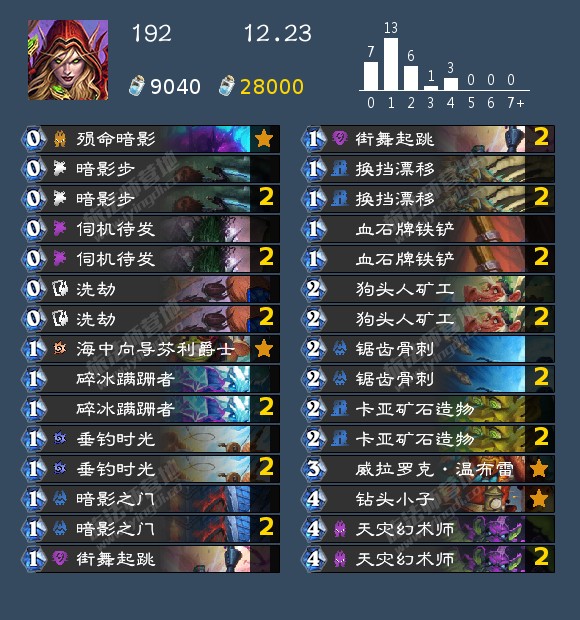 - 发掘贼(17,40,42,46,99,192,196,199)发掘贼的构筑真的很多,我个人比较看好192那位带洗劫的构筑,因为挖宝贼如果带了药剂或者类似的其他补资源牌很容易卡蝎子或者卡一手别的,这套在日报那边应该也发了,原帖是营地的,大家有兴趣可以去看看。其次就是带奔雷骏马的构筑,理由是开局钻头小子上手以后天灾幻术师依然有作用不至于是白板。