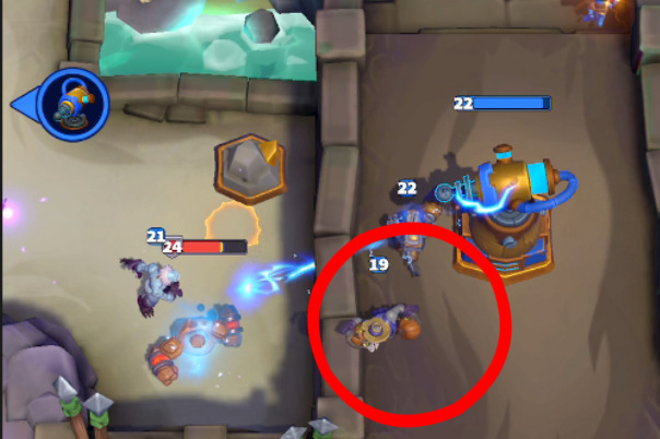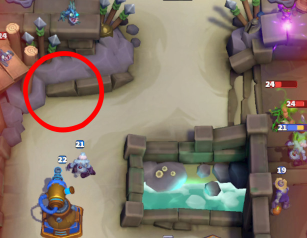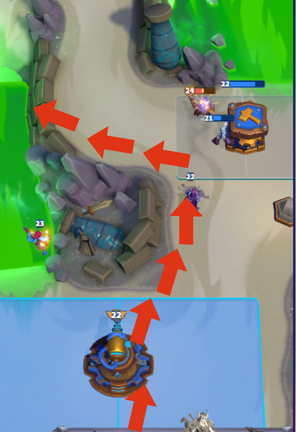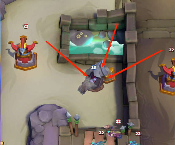 如果你带了8-9射程的棋子,那么他们可以在中路左侧,搭配野猪直接占领左侧防御塔,放置棋子的位置看图。