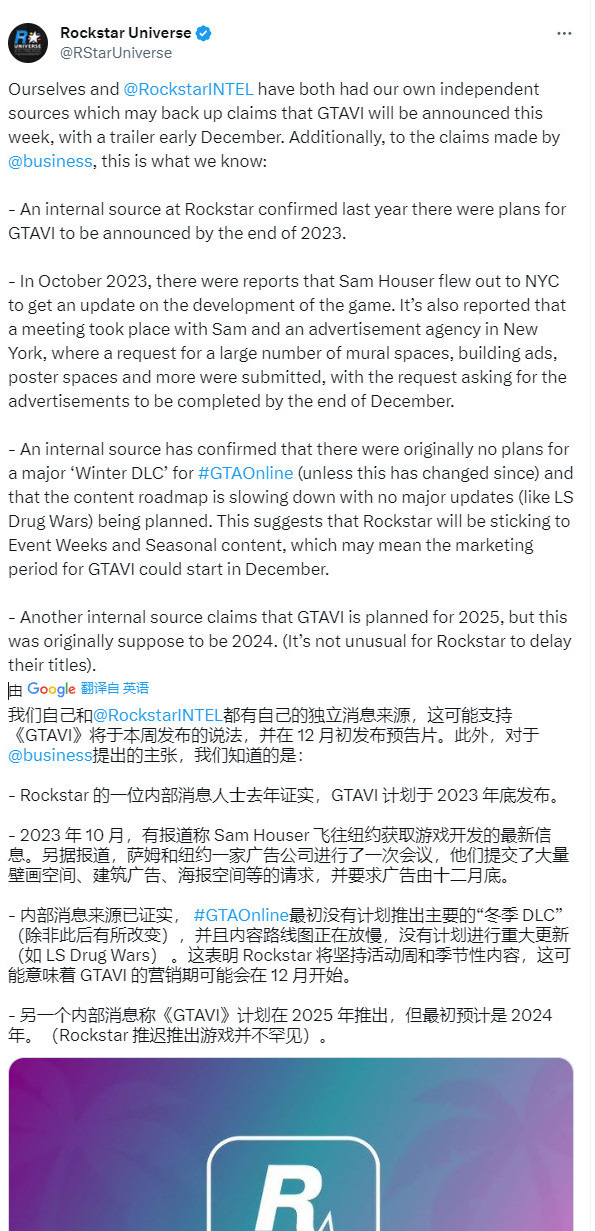 首先Rockstar Universe表示他们和RockstarIntel都有自己独立的消息源,证明彭博社的爆料——《GTA6》最快将在本周公布、12月发首支预告可能是真的。不过他们也发布了一些自己了解的内部消息: