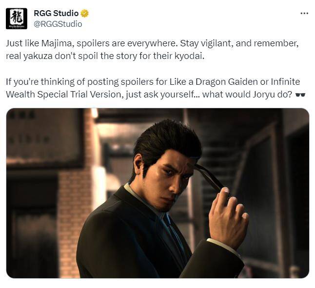 开发商RGG工作室还发布了新推文提醒玩家小心剧透,也警告想要剧透的玩家不要这样做,推文中写道:“就像真岛一样,剧透无处不在。保持警惕,记住,真正的黑道不会破坏好兄弟的故事体验。如果你正在考虑发布《如龙7外传》或《如龙8》特别体验版的剧透的话,先问问自己……净龙会怎么做?”