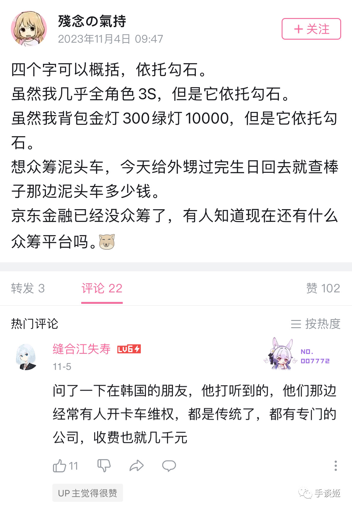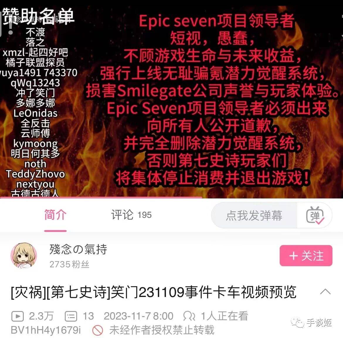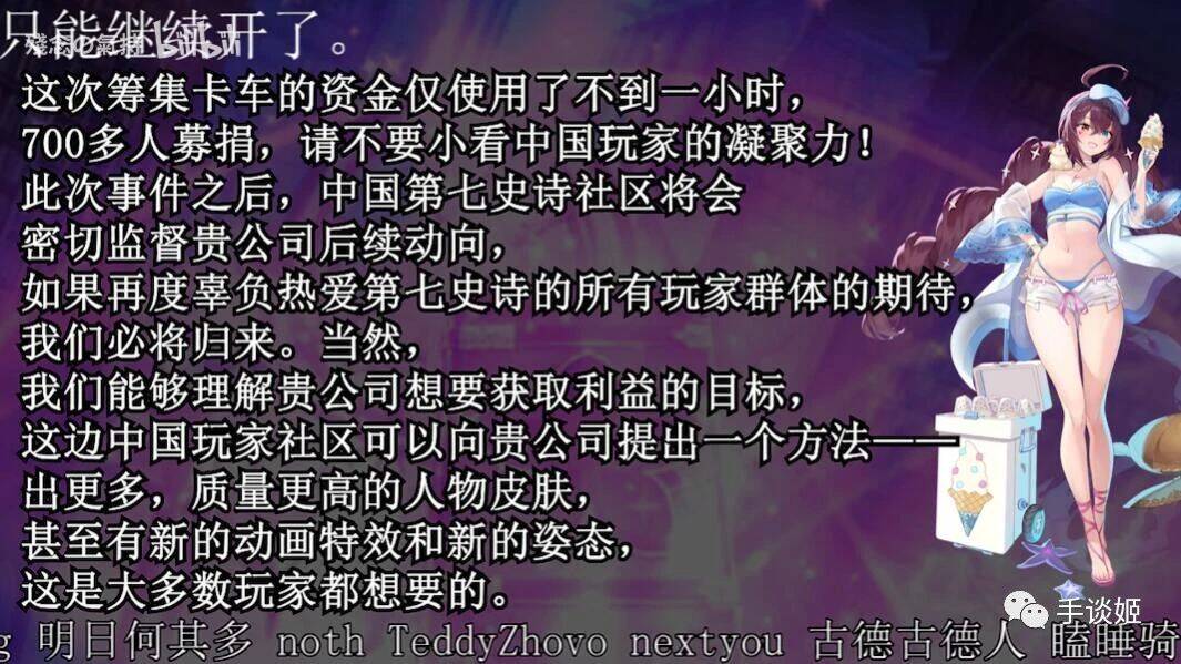 在这样武德充沛的情况下,不同的《第七史诗》玩家作出了不一样的操作。有表示消极退游的;有拍摄融号视频给官方看、就地成仁的;有采用官方渠道进行反馈建议,希望官方悬崖勒马的;还有效仿上述《赛马娘》相关做法,众筹宣传车去笑门楼下的。