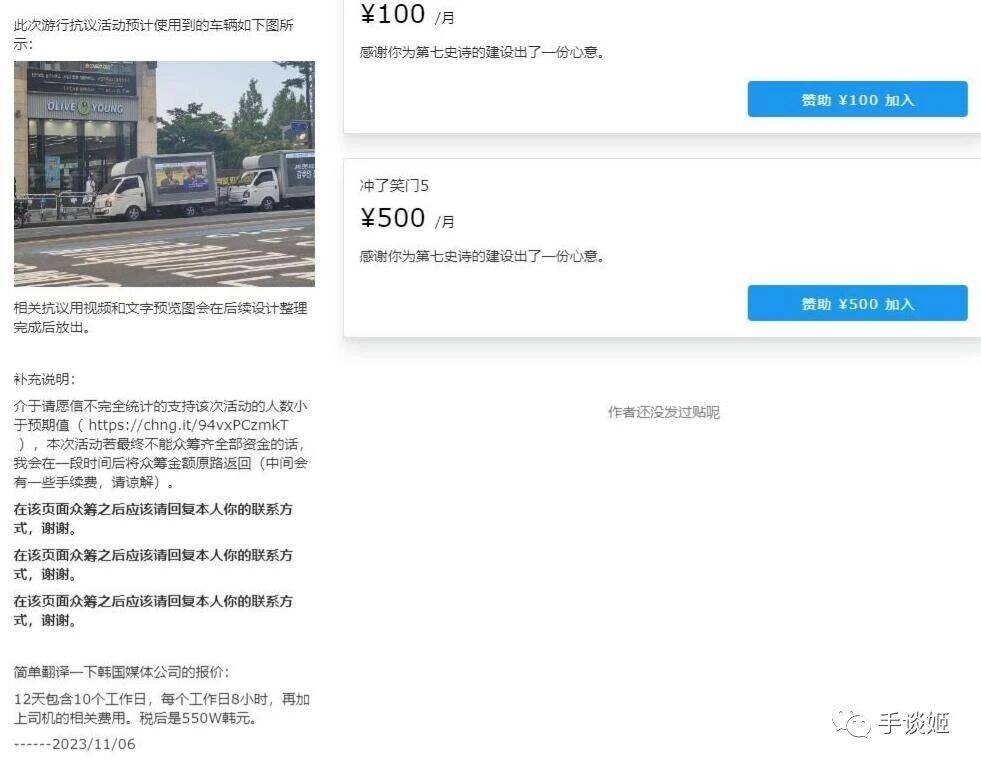 发起宣传车众筹的是国内的《第七史诗》玩家,据了解发起的众筹的不到40分钟的时间,就募集了约550万韩元(折合3万人民币),达到众筹的目标。