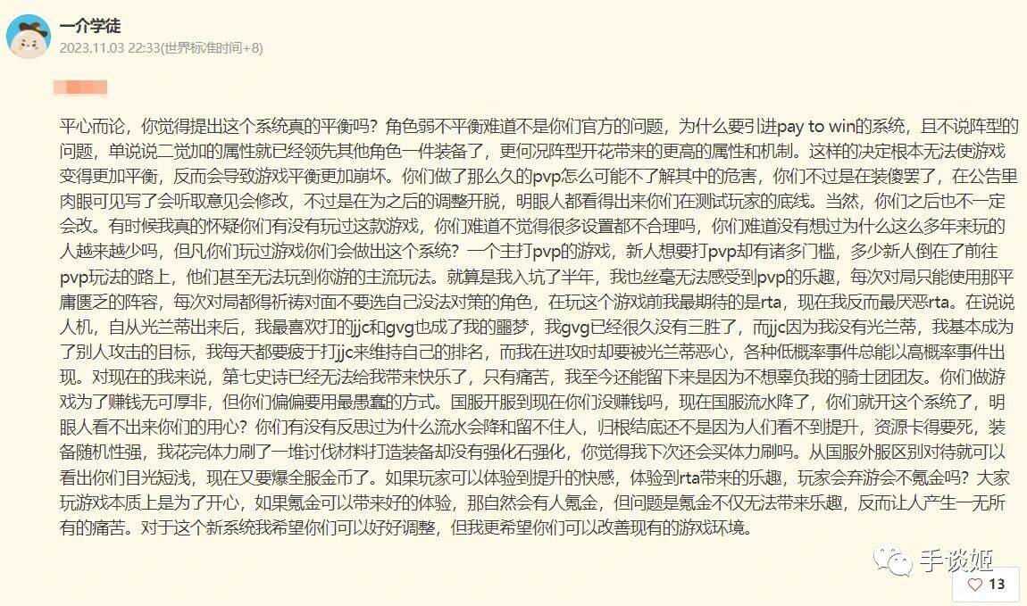 并且玩家们还指出,《第七史诗》是一款具有pvp机制的手游,增加养成成本意味着数值膨胀,意味着拉大重度氪金玩家和中低氪玩家间的差距,不光做不到更加平衡,反而会让原本的平衡进一步崩坏。玩家认为,官方的这次改动只不过是为增加新的氪金点来巧立名目罢了。