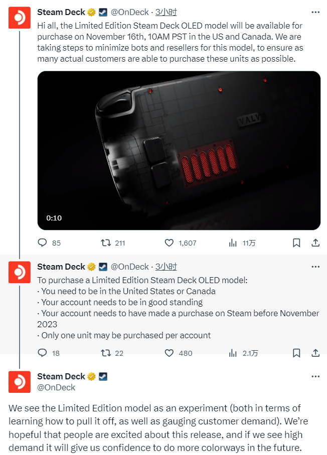 V社的最新限量版掌机Steam Deck OLED即将于北京时间11月17日凌晨2点正式发售,现在V社官方公布了该版本掌机的购买限制,这一举措是为了减少脚本和黄牛抢购,具体如下: