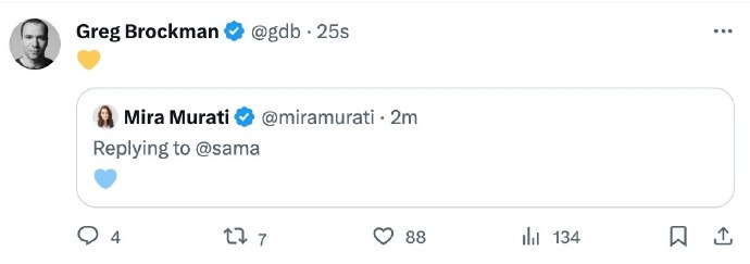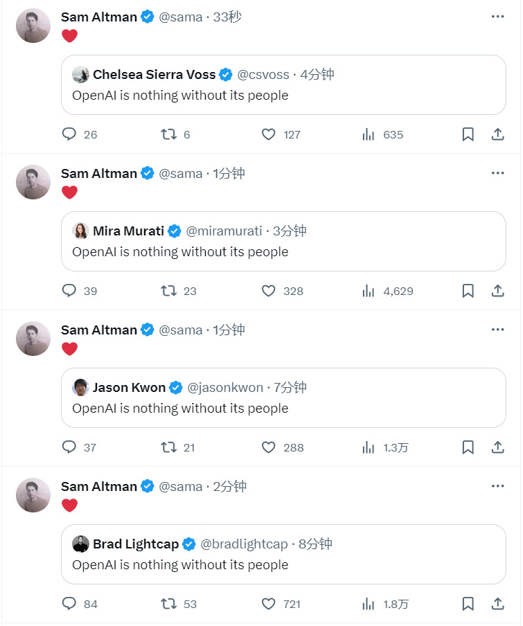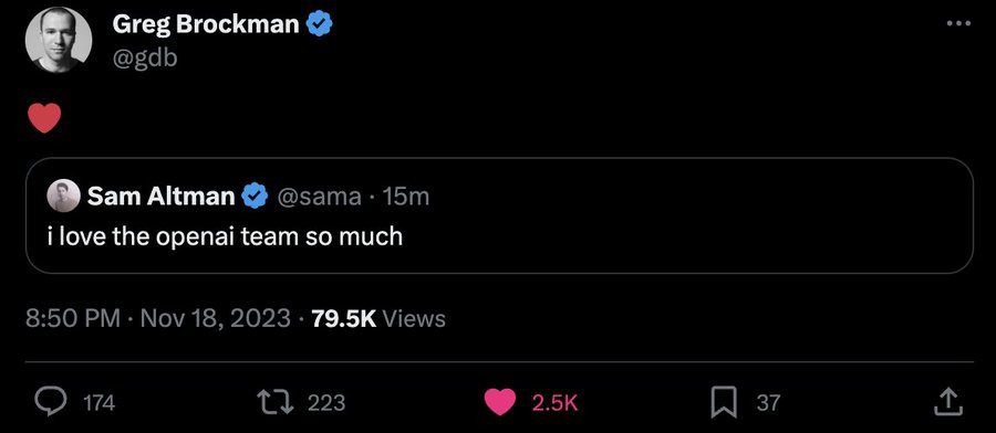 那边奥特曼和格雷格这俩小子变卦了,开始在推特上热情表白 OpenAI 团队。