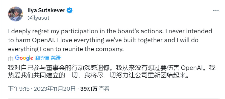 连 Ilya Sutskever 自己都开始反思这次的行动和决定。