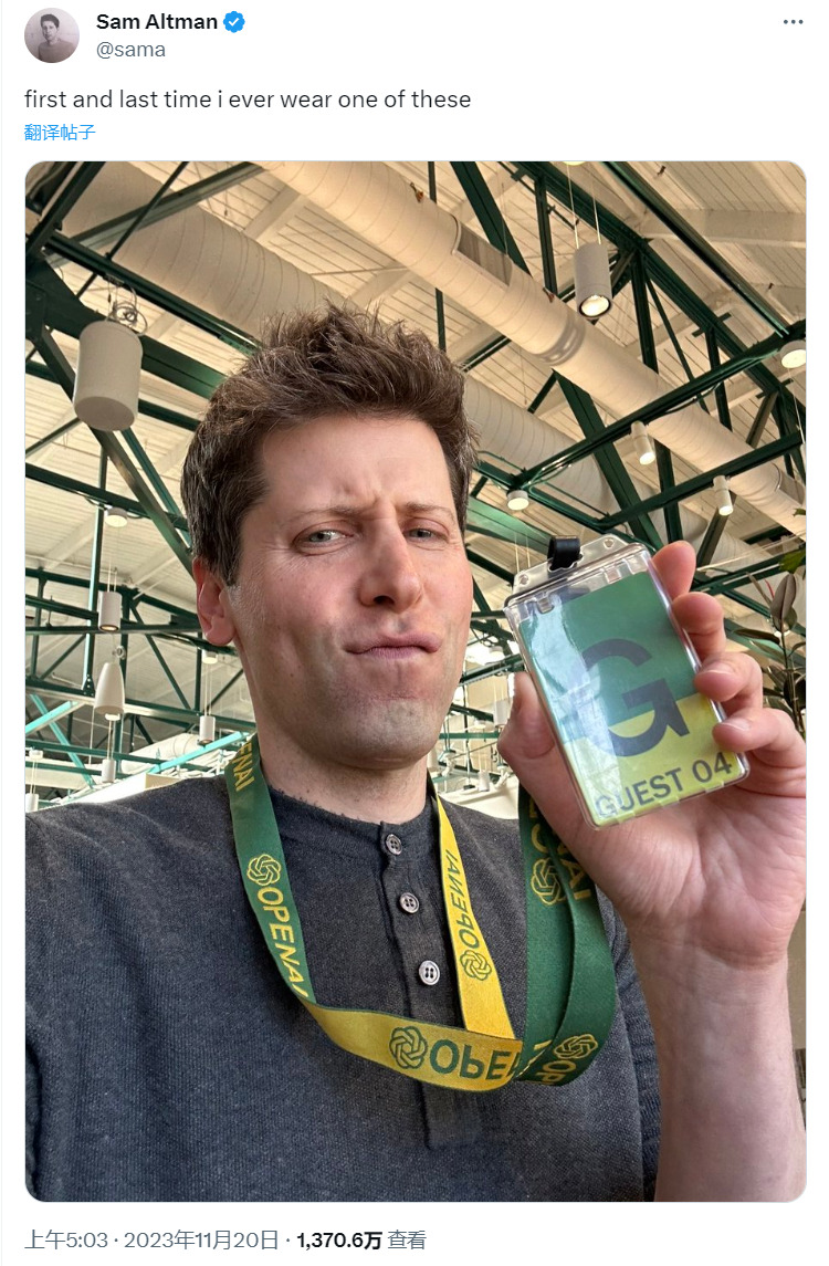 今天上午,奥特曼直接晒出了一张和 OpenAI 访客工牌合影的自拍照。