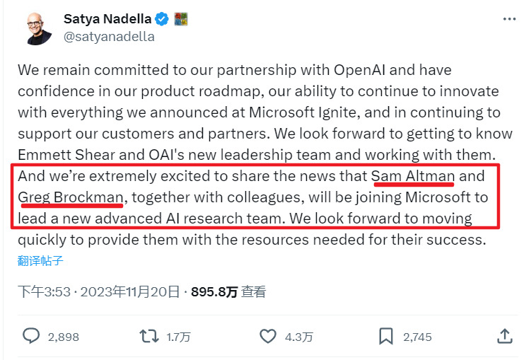 因为他们不仅不会回归,还在几个小时之后,正式宣布自己加入了微软。微软聘请哥俩,来领导一个新的 AI 研究团队。
