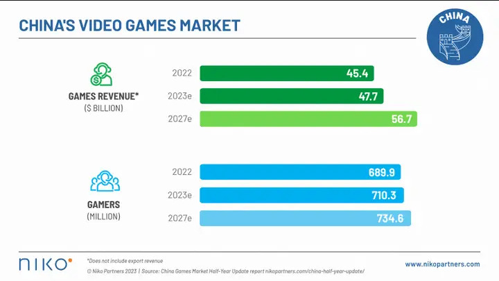 公司还预计中国游戏市场将持续增长,预计 2027 年收入将达到 567 亿美元。中国游戏玩家人数也预计将持续增加,但速度将较慢。Niko Partners 预计,2023 年玩家数量将增长 1.63%,达到 7.1 亿以上,复合年增长率为 1%,到 2027 年玩家数量预计达到 7.35 亿。