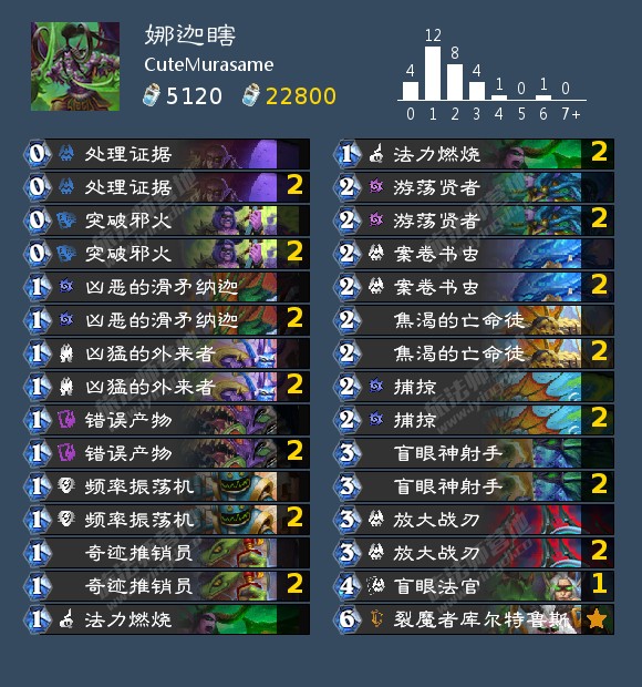 接上一条动态,欧服无ak构筑已经打进前50,江月这套构筑也从(美服)300多打进前50,@losts- 也用我上次动态发的卡组从(欧服)300多打进前百,证明了这种构筑在狂野是很有竞争力的,打各种宇宙卡组都是有一定优势,打除偶萨以外的快攻也都是小优势,感谢两位同好对卡组的测试,建议和改进。