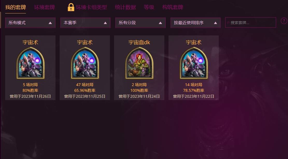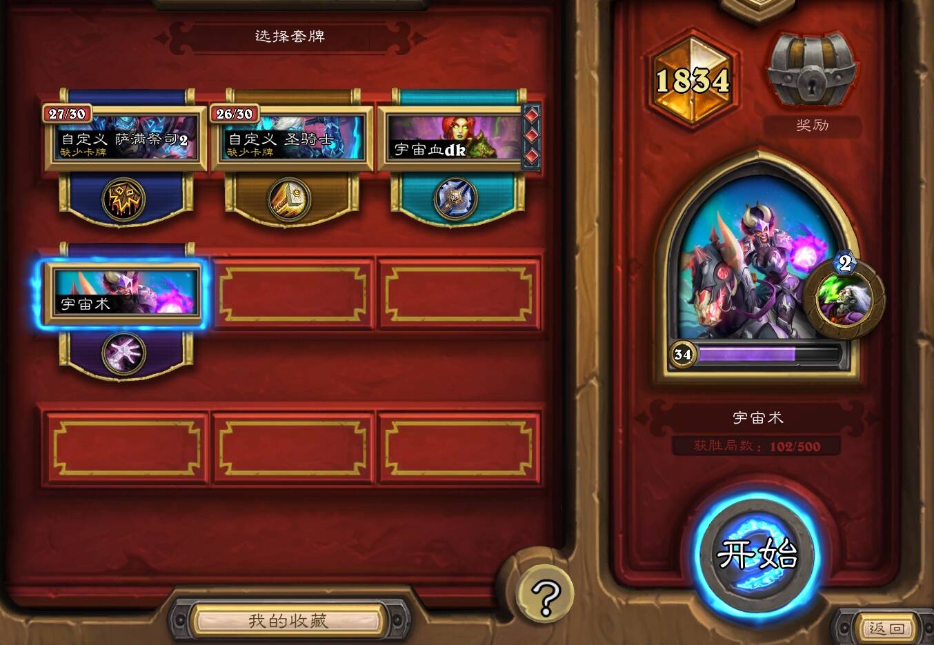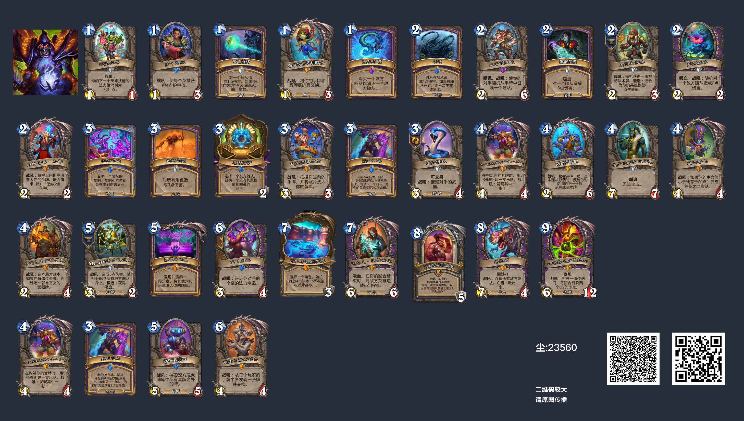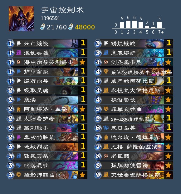 本人是控制及宇宙卡组狂热玩家(之前最喜欢的卡组就是宇宙术,上个版本喜欢控制术和控制牧,虽然没有终结手段的牧师有点无聊),今天用自己修改调整的30宇宙术以70的胜率10星打上传说两千名,所以来和大家交流交流。