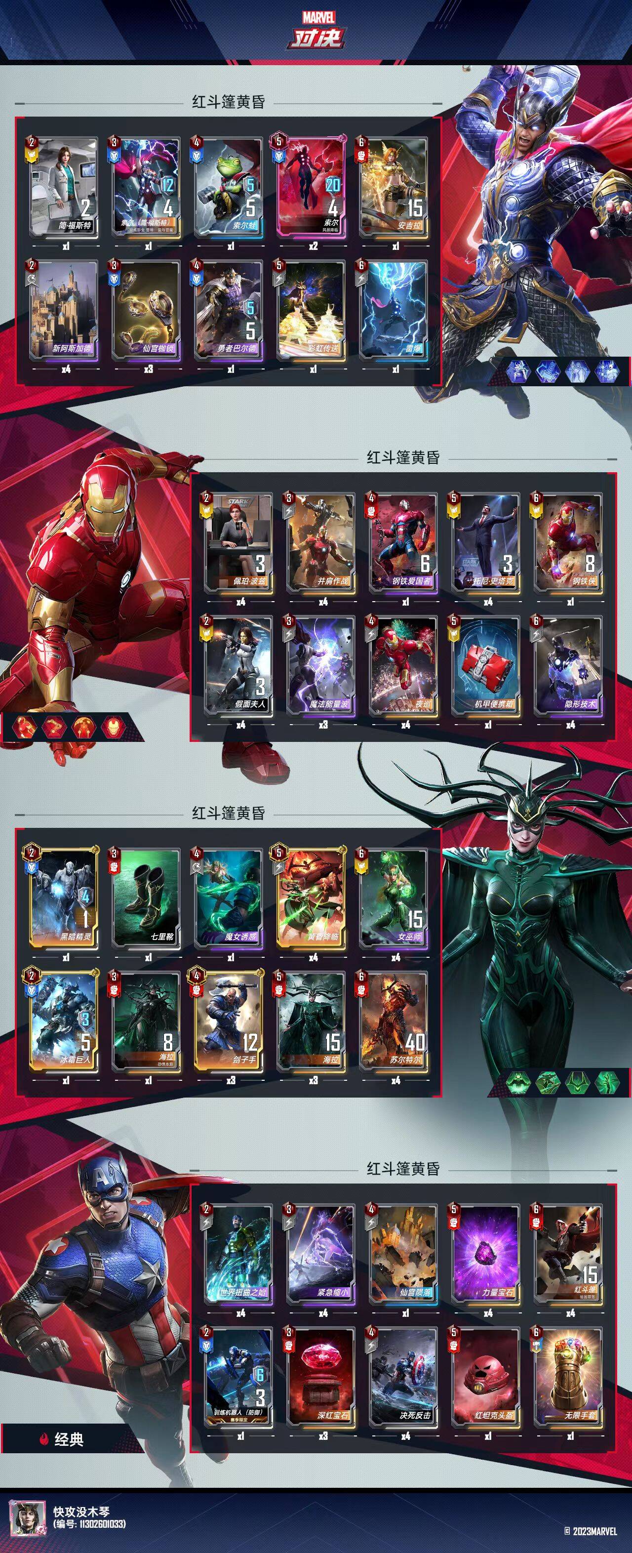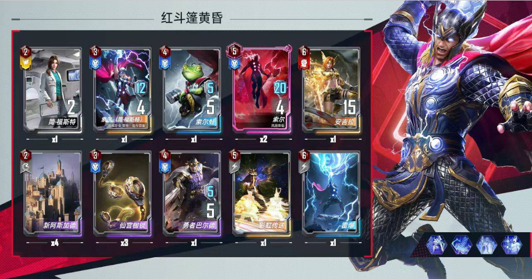 雷神卡组分析:2费的简和3费的女雷神是前期极强的5费2随从组合了,用来提升前期战力。4费带青蛙和巴尔德是因为这2张卡都是5战力,可以被力量宝石烧掉,加快滤卡。5费彩虹传送可以多带一点,一定要4败后再用。4败后时候得4张卡,有概率出关键卡,就算没有关键卡,全部卖掉也只亏1,2费,性价比不错。(我只带1张是因为我只有1张....)2张5费粉索很重要!!!中期是本卡组最鸡肋的时候,就算有400攻的红斗篷也捉襟见肘。因为本卡组到了中期除了红斗篷,其他随从一碰就碎。很容易就被坚甲复联,卡耐基,洛基,粉索,伊戈等卡组刷起来。而2星粉索只要10费,就能在第一次进攻时打出88点伤害,破敌后还能再刷,性价比极高。6费带安吉拉和雷暴是因为红斗篷有概率送这2张卡,安吉拉带力量宝石配上给了雷暴的粉索,经常能打赢生死局,实现争二保三。