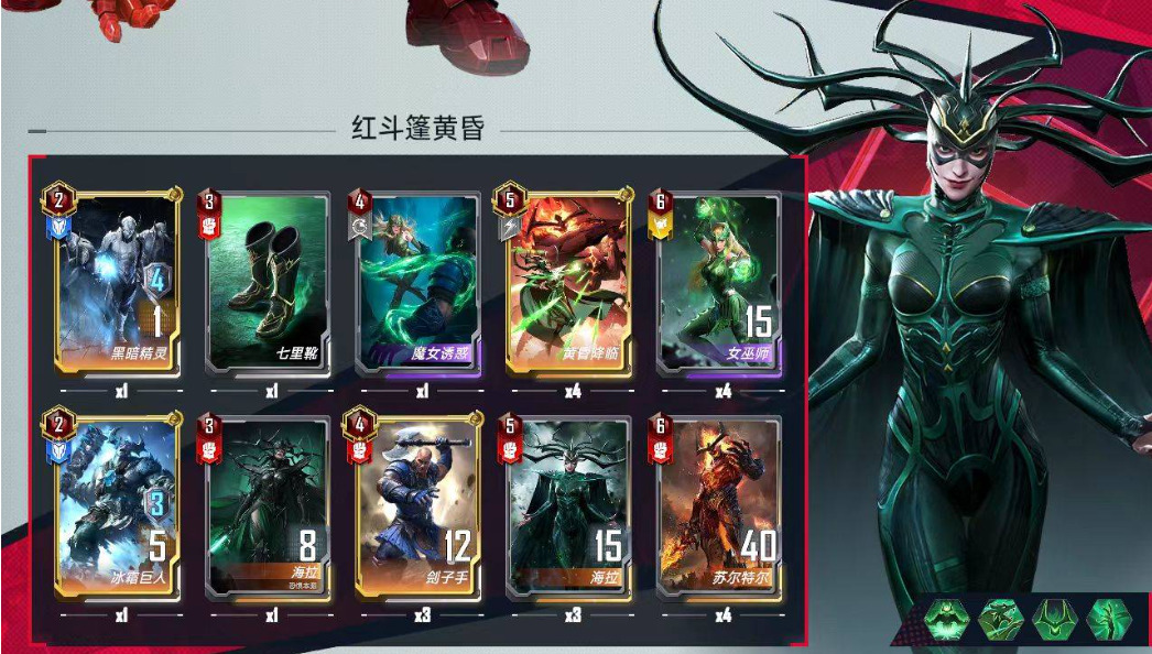 三到六回合:全力找秘闻!全力找秘闻!全力找秘闻!除了红斗篷,假面,小辣椒这三张卡,其他任何卡都可以为了买秘闻而卖掉。多使用模仿大师+小辣椒+并肩的配合,既赚钱又免费刷新。关于4种秘闻卡,如果场上没有红斗篷,可以把枷锁给冰霜巨人或九头蛇士兵提升一些战力,等找到红斗篷后就可以无脑卖了继续找秘闻。能量波在前面买到时无脑卖,等买了9,10张秘闻后再买到能量波可以适当使用。红宝石在前期可以给红斗篷和海拉,但如果在买秘闻时差钱就一定不要舍不得卖。如果对方有凯旋银武可以保留2张红宝石,不然留一张红宝石给红斗篷即可。事件秘闻在钱用光后还没刷出秘闻时,就放入卡槽使用,在刷到秘闻没钱买时就卖掉买秘闻。总结一句话,除了红斗篷,小辣椒,假面三张卡,其他卡都可以为了买秘闻而卖掉。六回合时,尽量找到三张以上假面时再升本,没必要一次性升到5本,可以分两次升本,说不定在四本时就遇到了仙宫陨落。