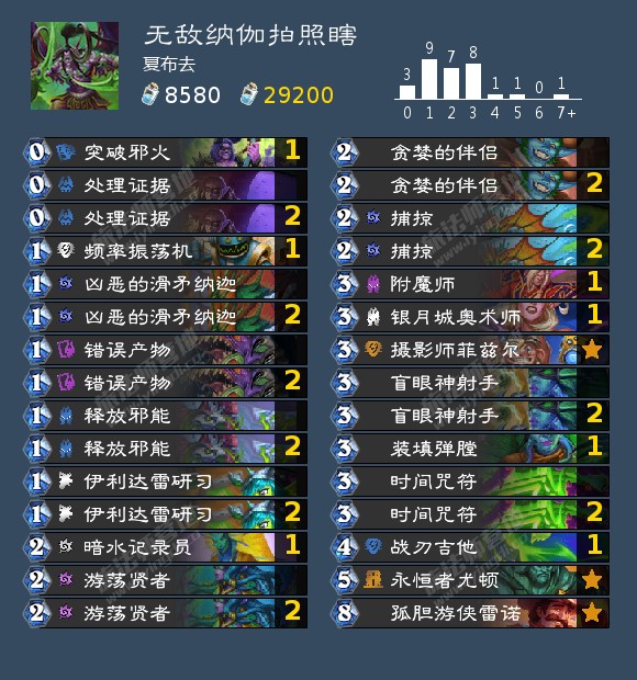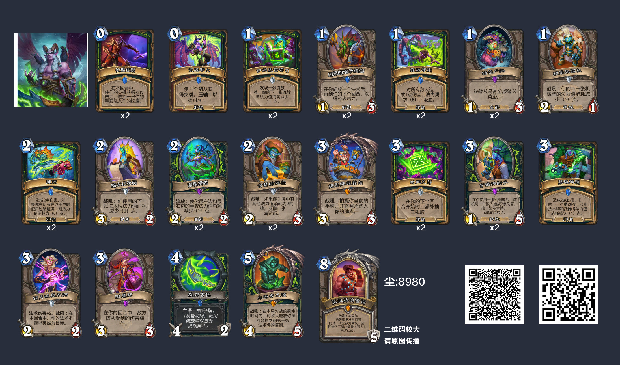虽然神射手被削弱了,但基本没影响,不过现在这个环境对这套卡组很不友好,黄DK太多,基本不会打到10费,而且我们还有天敌-病DK!而且现在的控制卡组为了打病DK,还会在牛牛里塞一张机器人!所以很难打出来!啥时候病DK和快攻少一些了估计这卡组就能玩啦~!
