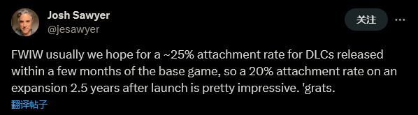 20% 的“依存率”到底好不好,对于并非游戏业内的普通玩家来说可能很难理解,但显然这个数字非常高,特别是考虑到 DLC 发售是在游戏本体推出数年后。这个数字收到了黑曜石设计总监,以《辐射:新维加斯》、《永恒之柱》等 RPG 闻名的 Josh Sawyer 的称赞。
