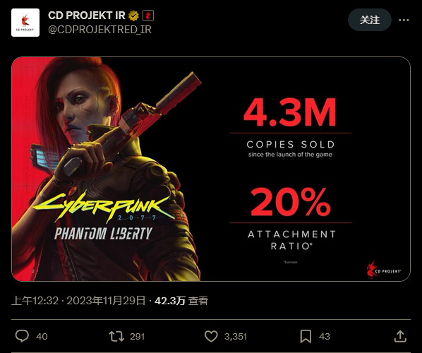 CDPR 上个月还表示,《赛博朋克2077》售出了约 2500 万份,在 2.0 更新和 DLC 后,CDPR 表示他们已经成功打了一场翻身仗。此外,公司表示 430 万份 DLC 销量相当于约 20% 的“依存率”,即仅有 20% 购买了《赛博朋克2077》的玩家也购买了《往日之影》。