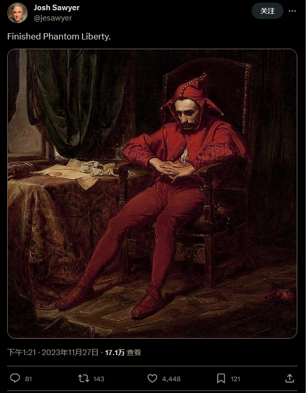 他自己也已经通关了《往日之影》,达成了“权杖国王”的结局(将百灵鸟送上月球的结局)。他显然受到了剧情的感染陷入了抑郁,发了波兰艺术家 Jan Matejko 所绘制的著名画作《斯坦齐克》,画作描绘了一位神情阴沉的宫廷小丑。