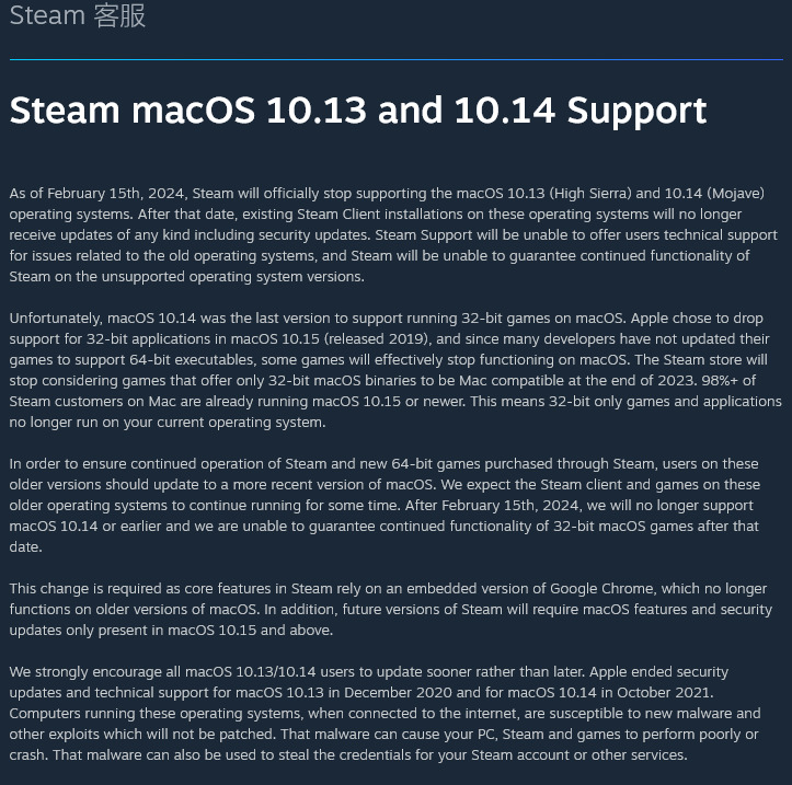 Steam 对 macOS 10.13 和 10.14 的支持将于 2024 年 2 月 15 日结束。