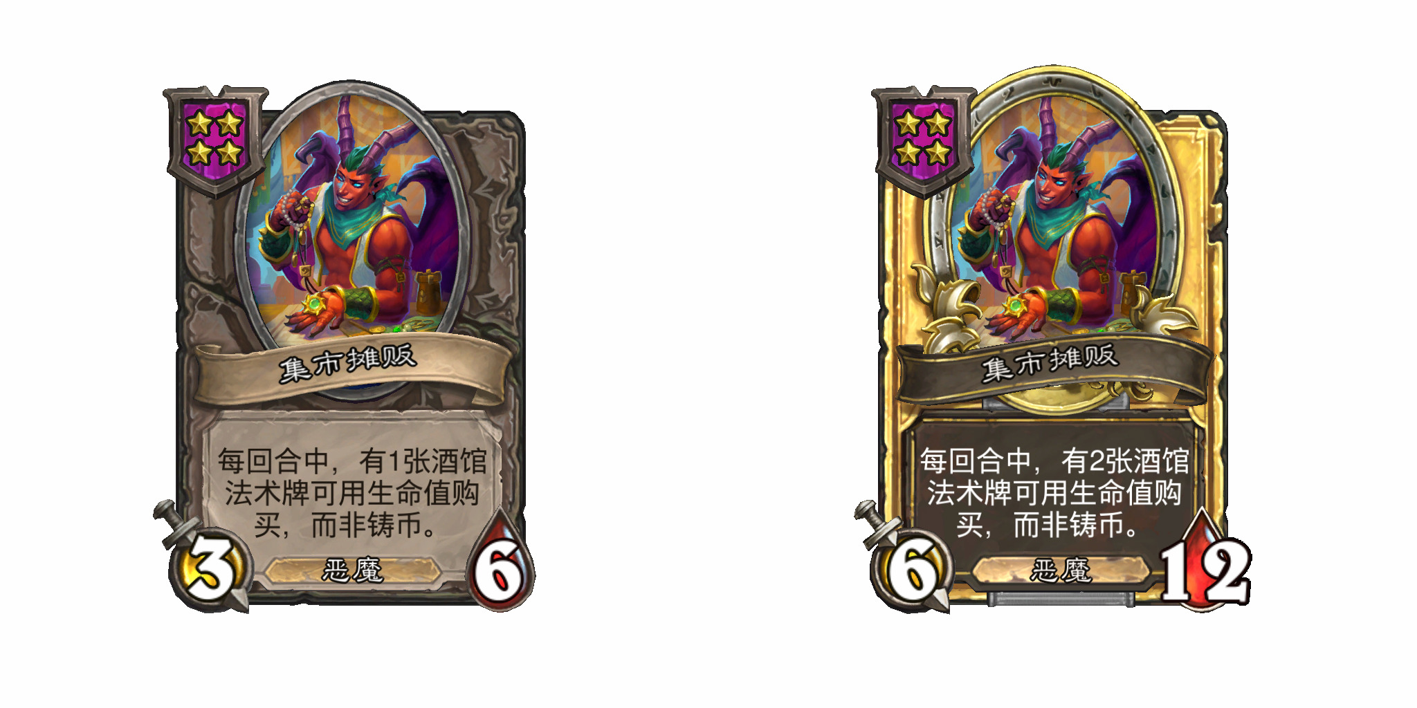 - 4星3/6恶魔,每回合中有1张酒馆法术牌可用生命值购买,而非铸币。