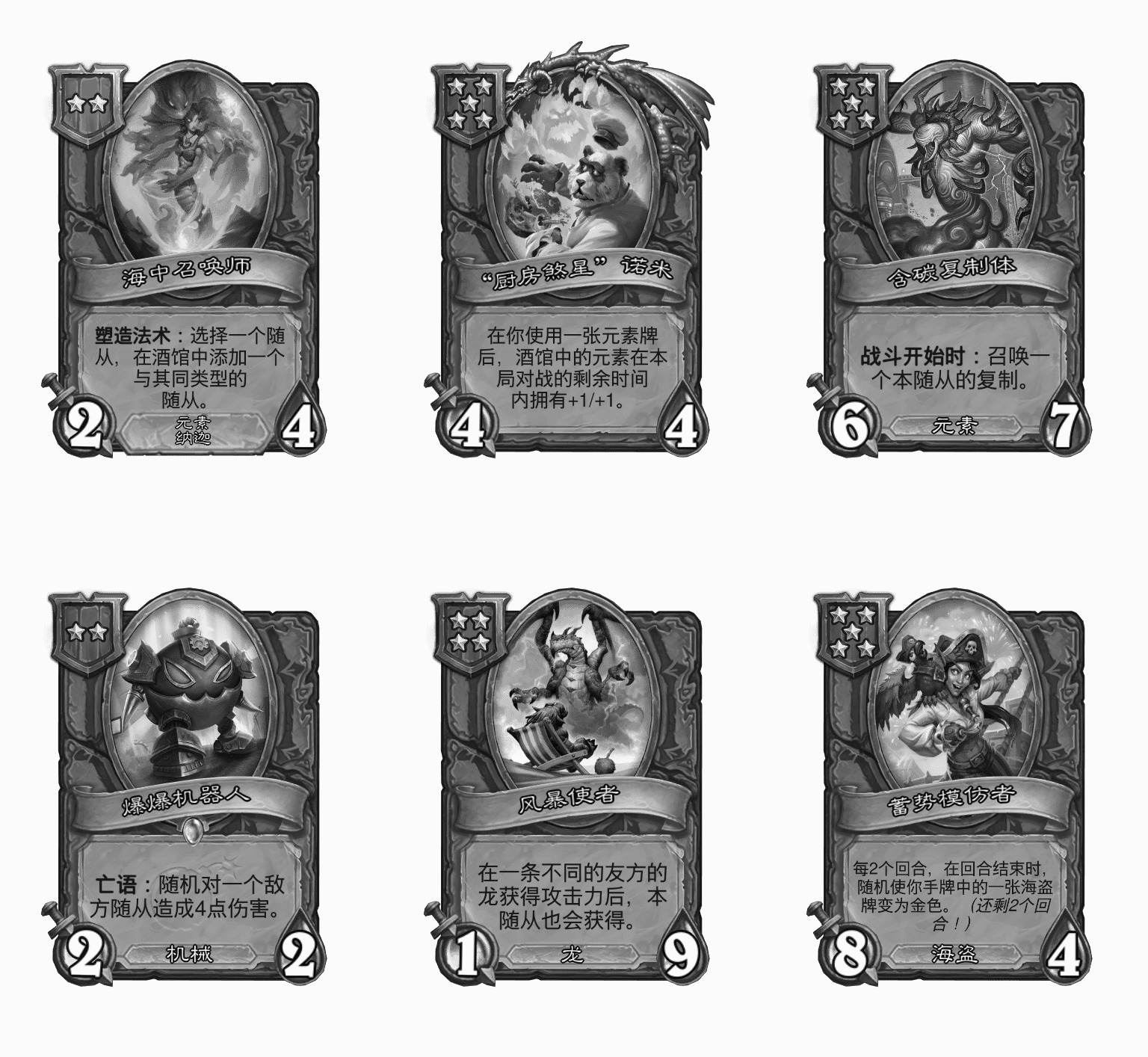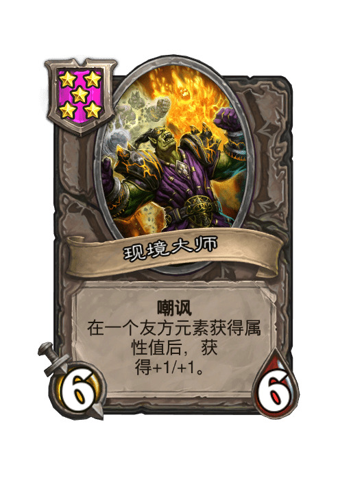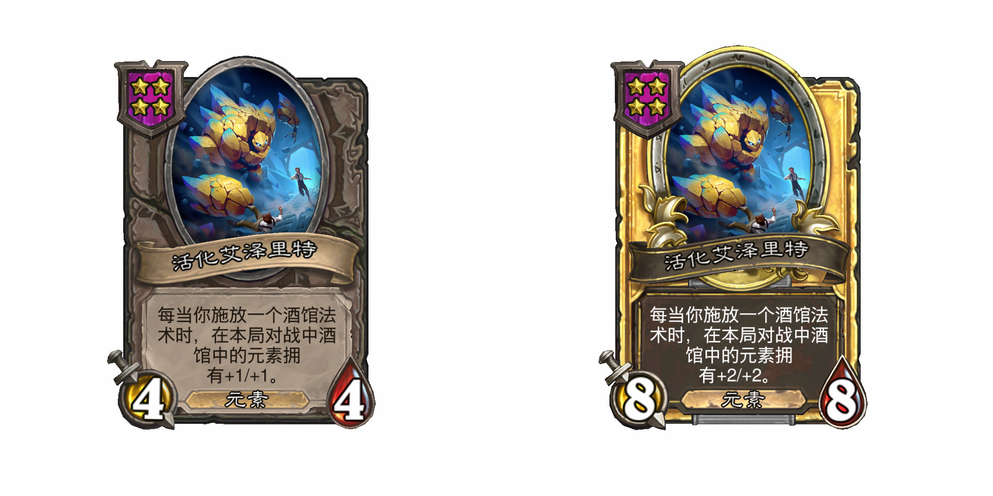 - 4星4/4元素,每当你施放一个酒馆法术,酒馆中的元素在本局对战中获得+1/+1。