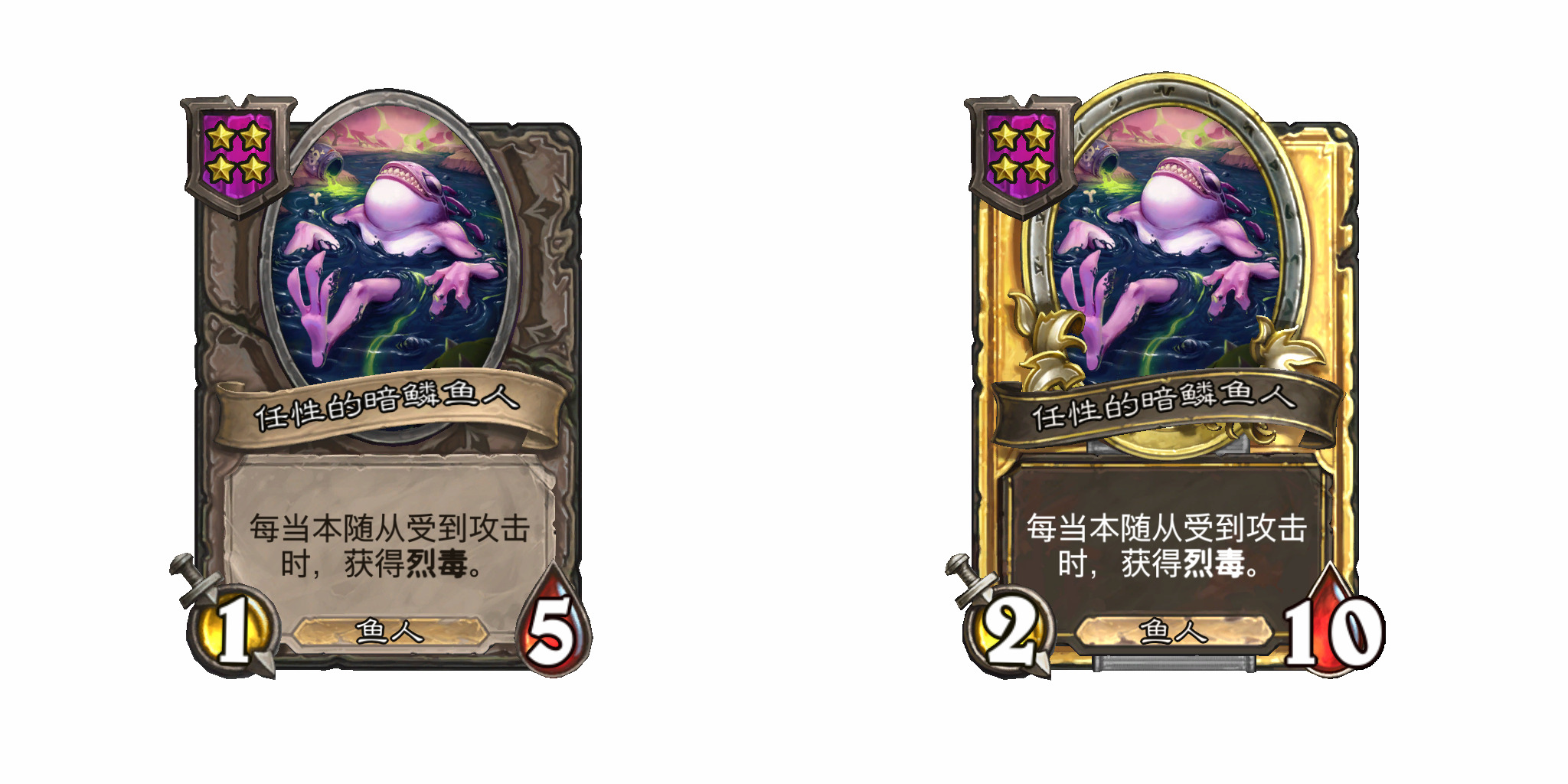 - 4星1/5鱼人,每当本随从受到攻击,获得烈毒。