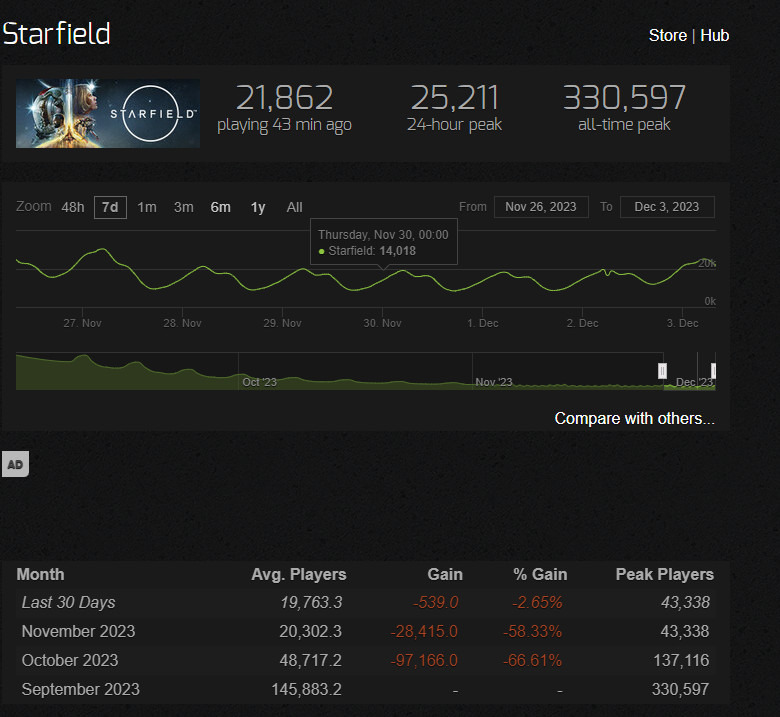 根据SteamChart,过去30天内,《星空》Steam平均在线玩家19763人。在线玩家从9月到10月,流失9.7万人,从10月到11月流失2.8万人,11月至今流失539人。也就是说,整体来看,《星空》Steam在线是慢慢下滑状态,没有新增记录。