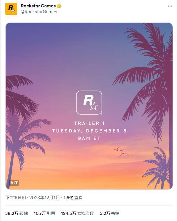 R星月初在其官方推特账号上发布了预告的预告,为将于美国东部时间12月5日上午9点发布的预告片进行预热。该条推文已被查看1.5亿次,获赞数接近200万。