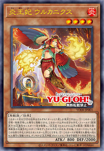 ①:这张卡召唤·特殊召唤的场合才能发动。这张卡以外的自己手卡·场上(表侧表示)1只炎属性怪兽破坏,从卡组把「炎王妃 ウルカニクス」以外的1只兽族·兽战士族·鸟兽族炎属性怪兽加入手卡。那之后,可以把这张卡的等级变成和这个效果加入手卡的怪兽相同。