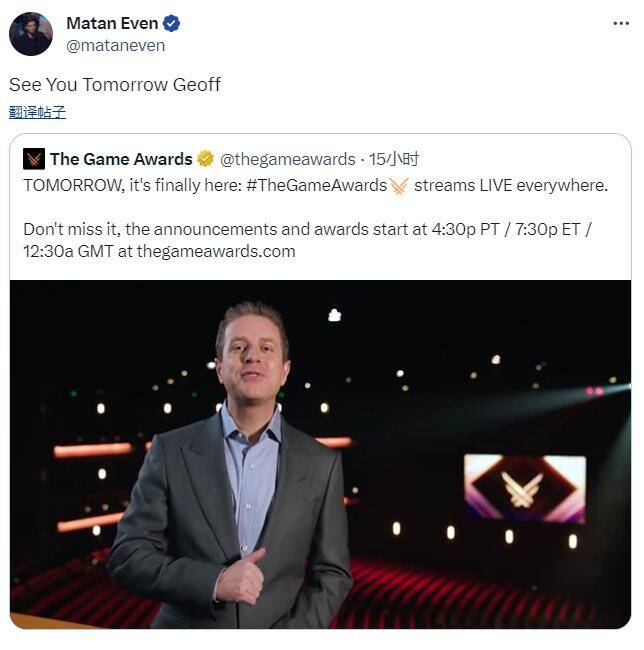 Matan Even在推特上转发了TGA官方的推文,并表示“明天见,杰夫”,杰夫·吉斯利(Geoff Keighley)是TGA活动的主办者和主持人,去年在Matan Even入侵年度游戏颁奖典礼后,杰夫·吉斯利立刻在推特发文宣布已抓住入侵者。