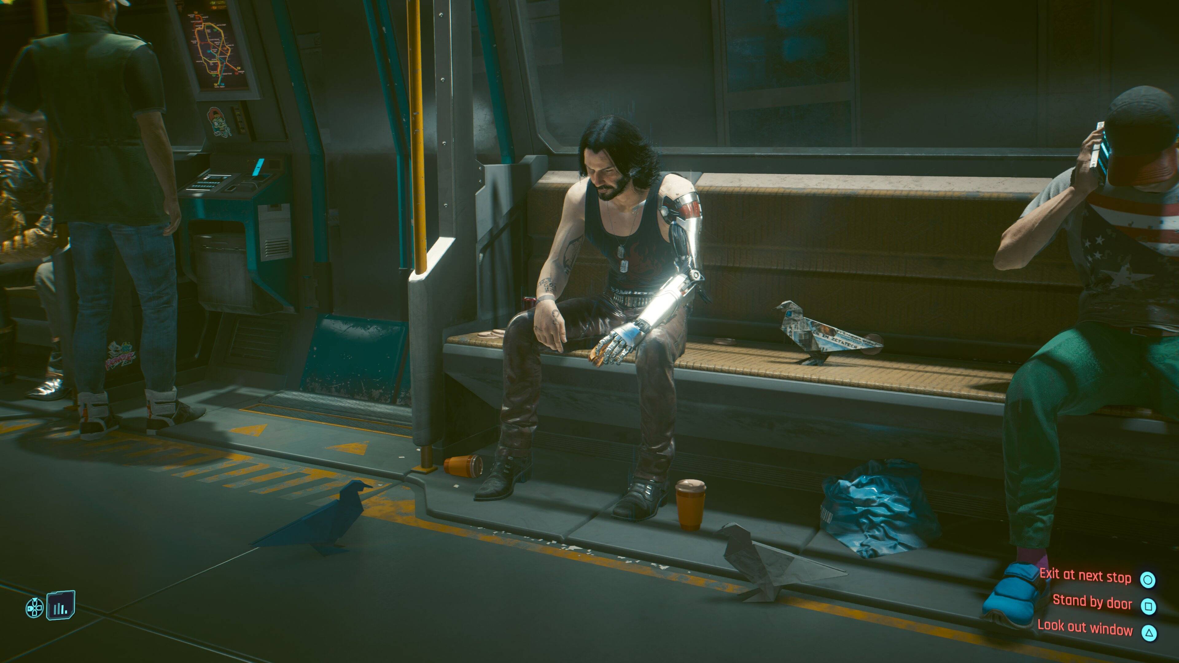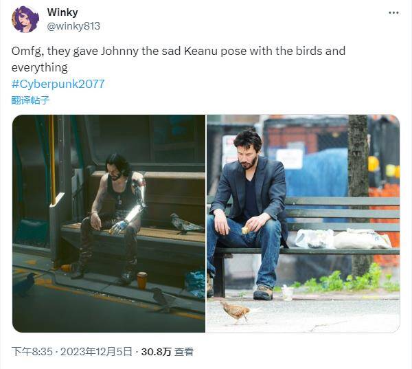 熟悉强尼·银手扮演者基努·里维斯的玩家,看到这一幕想必早已会心一笑。强尼的这幅造型,与基努·里维斯十多年前被人拍到独自坐在长椅上吃三明治时的形象如出一辙,甚至连脚边的咖啡和鸽子都进行了还原。