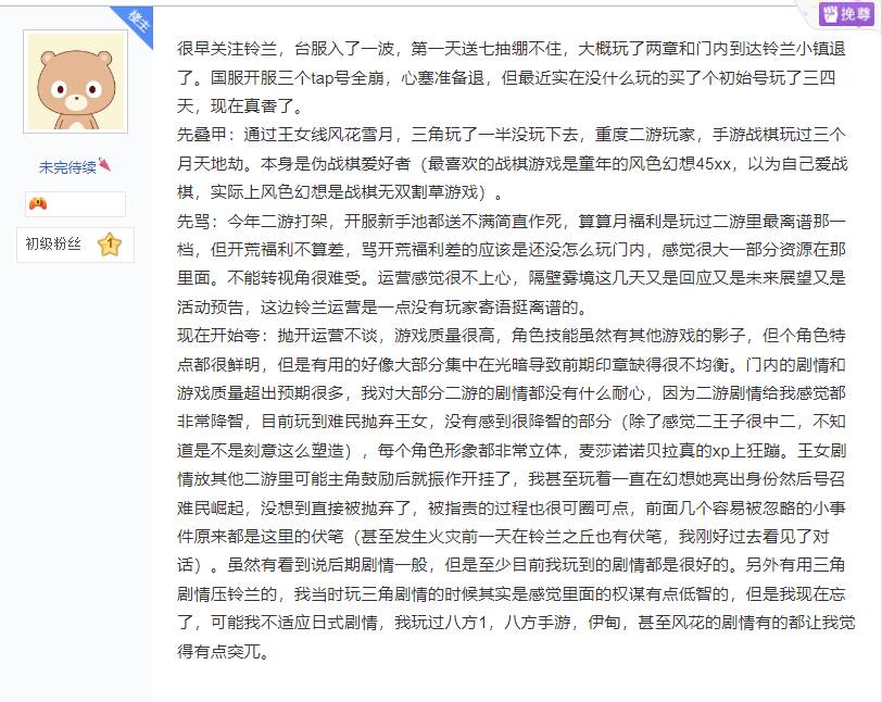 毫不夸张的说,游戏仅上线两周就发起了如此诸多的活动,不得不感叹作为开发组的极心社在这期间对游戏持续的进行研发优化运营,也难怪在各个社区都能目击玩家对铃兰的口碑持续向好。在贴吧,你不仅能看到早先颇有怨言的台服老玩家现身说法,指出铃兰早期在运营与福利上的不足,甚至一度有过弃坑的打算。但在后续的体验中,还是会因铃兰自身的高品质、剧情质量而留下。