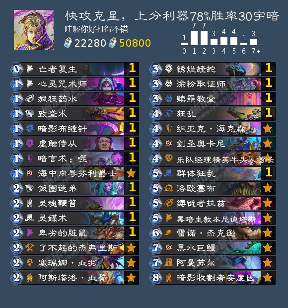 哈喽,标准上传以后征战狂野,我发现狂野的环境好多分奴,偶数萨和剑鱼贼占很大部分比重,我这一套中速暗牧就专门抓快攻,同时也有针对牌打otk卡组,完美符合环境,胜率也颇高。