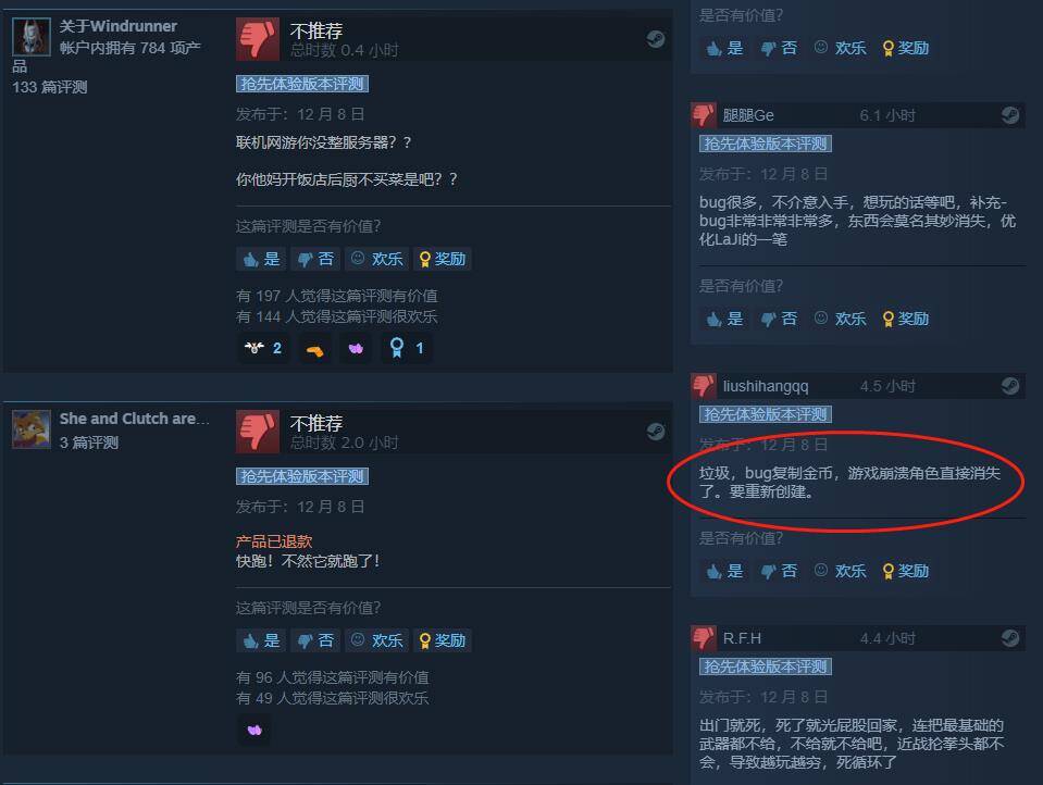 此外玩家吐槽最多的就是游戏BUG多,甚至就是个半成品,地图场景有80%左右都不可互动。还有玩家利用BUG复制游戏金币,结果再次触发BUG把游戏弄崩溃,角色直接消失。