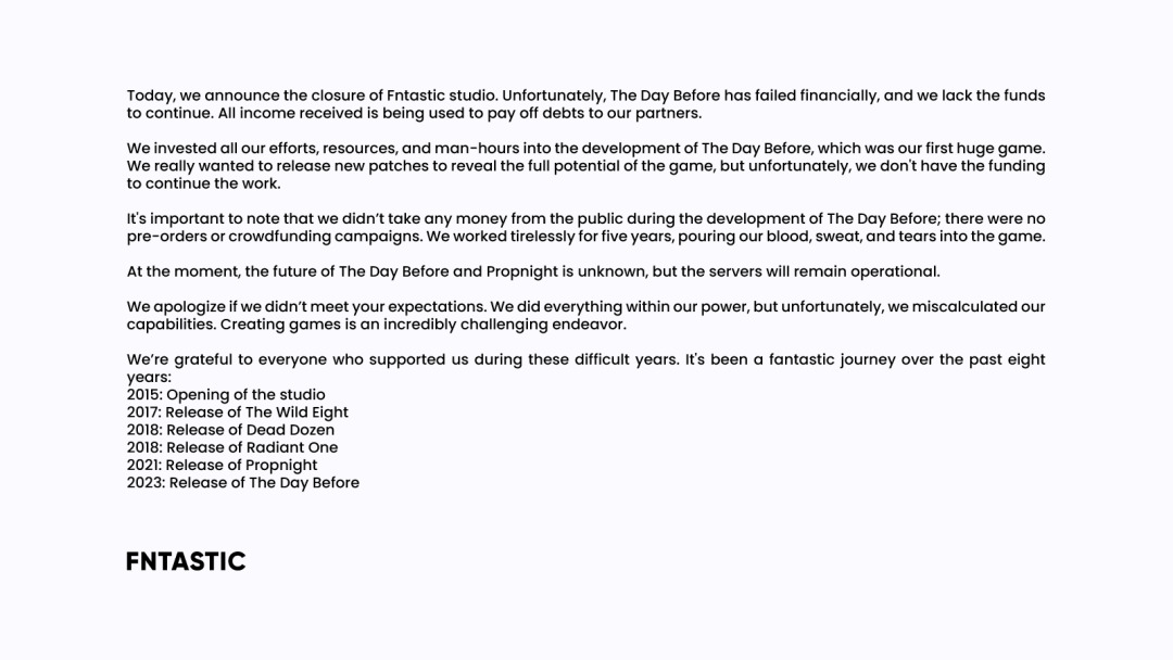 到了今天,看到事情无法挽回的FNTASTIC终于不再试图掩饰,发布了关闭工作室的公告,关闭了《浩劫前夕》的付款渠道,似乎打算就此隐退江湖。
