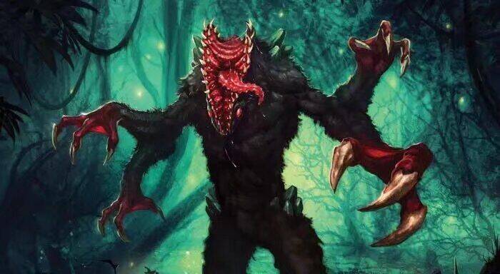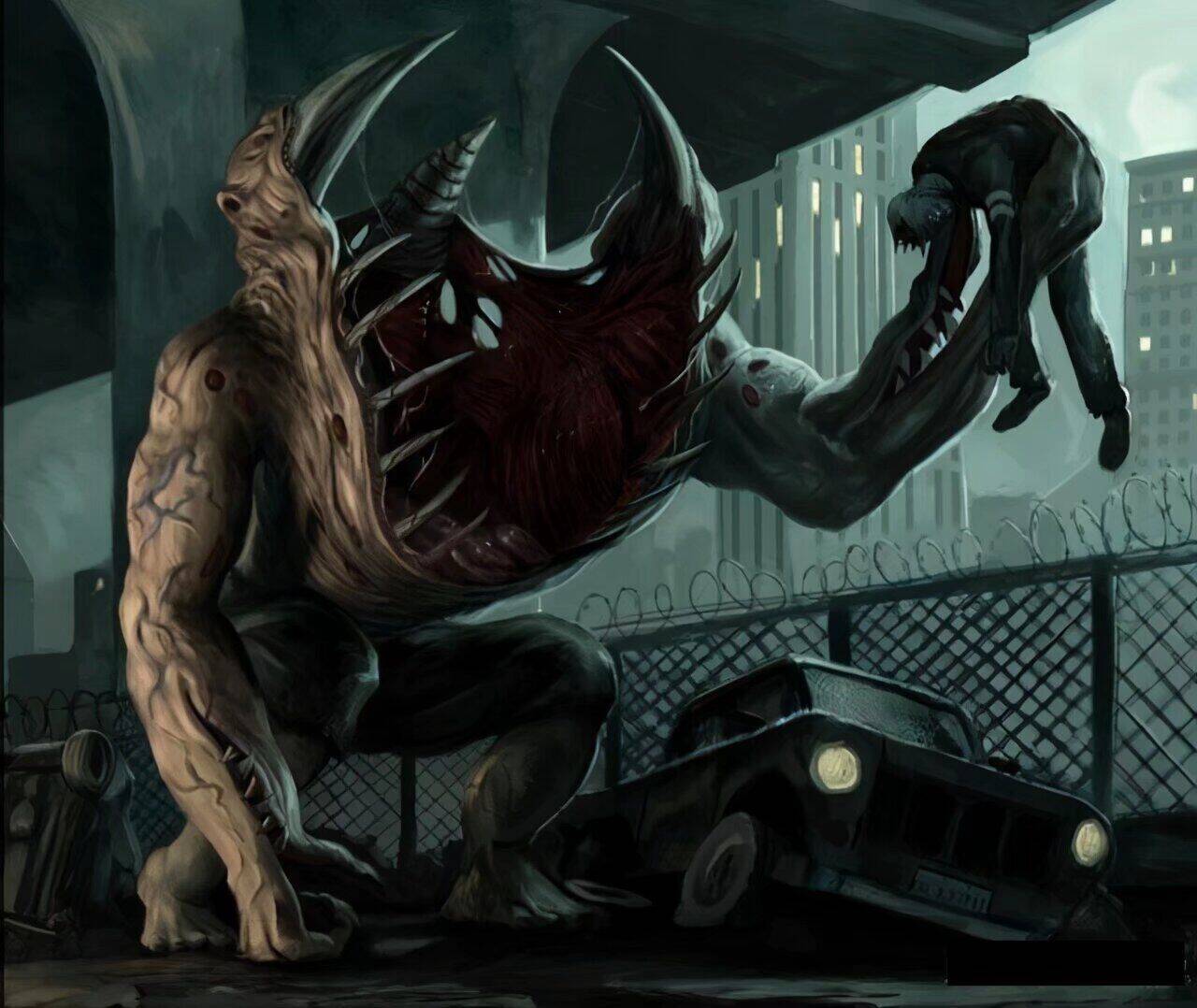 “那怪物的脚长达两英尺半,**可怕的钩爪。然后,又一只脚出现在眼前;接下来,一只覆着黑色软毛的巨大手臂出现了,那手臂在前端分裂成两支,每只手都长得和脚爪酷似。随之现形的,是两只发出粉红色亮光的眼睛,醒来的巨人那像桶那么大的头颅摇摇晃晃地露了出来。两只眼睛在头部的两侧,各自突出达两英寸,被粗毛和骨头保护着。但是,头颅上最令人恐惧的,还是它的巨口:那张嘴不是水平、而是垂直地生**,生满了巨大的黄牙,从头顶直裂到下方。”