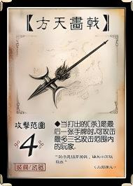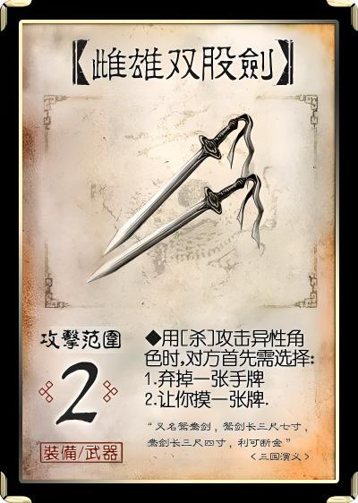 这把武器跟随吕布一起南征北战,不知多少兵将折损在其刀锋之下。不过在游戏里方天画戟是真不好用,这把武器的效果是自己手中只剩一张杀的时候,可以选择3个角色作为目标。虽然效果不错的但是基本上很难触发,而强行让空手牌的话,也是很危险的事情。