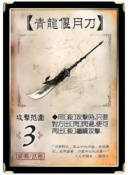 这是关羽的成名兵器,可以说家喻户晓。不过在游戏中这把武器只能算是一般,说它没用似乎又有一点用,真要说用处有多大也算不上。如果用多张杀才能换对方掉一点血,这本身就不太划算,而且很多武将没有额外摸牌技能,加上都存在断杀的问题,大多数情况下是根本打不出理想效果的。