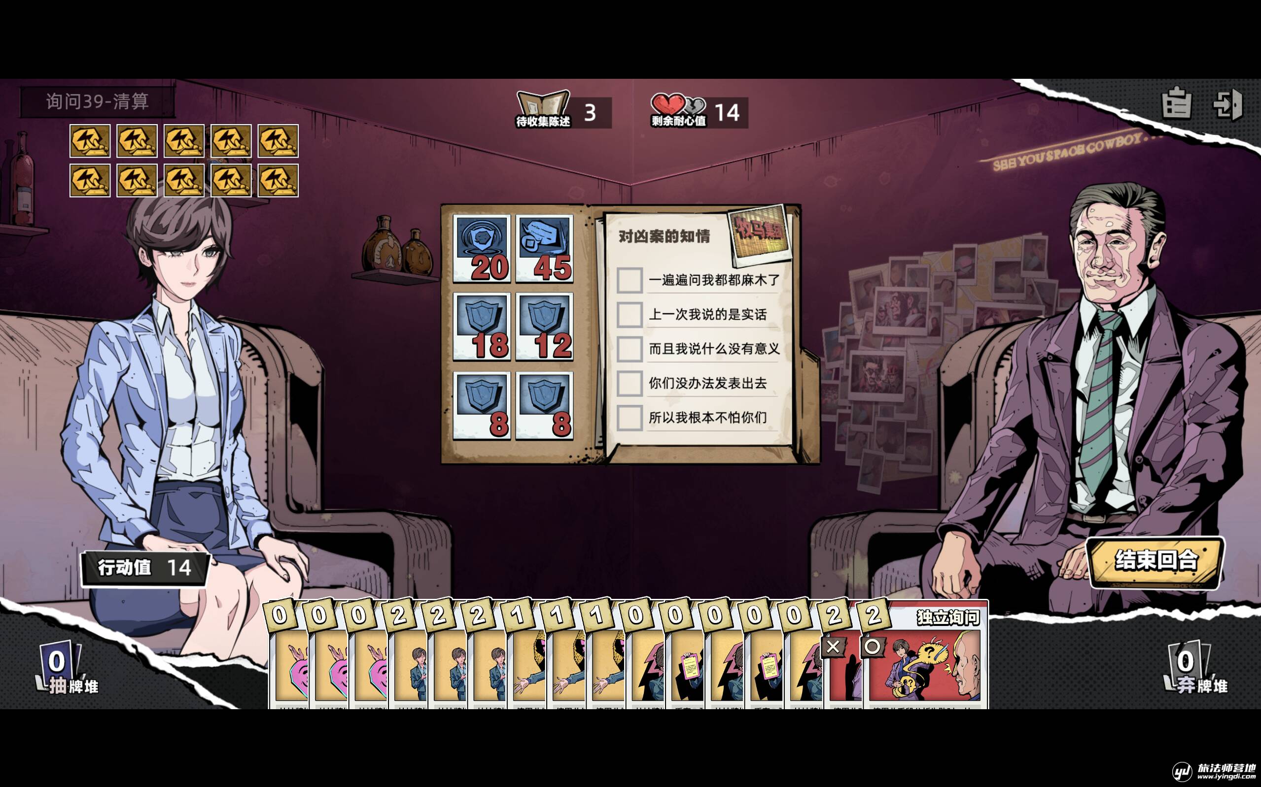 我一周目的时候我是用“分析流”通关的,但是当时用的都是比较基础的卡进行分析(「非描述询问」、「独立询问」、「直接问题」、「简洁问题」、「摒弃否定」),然后通过基础的「由宽至窄」、「引导陈述」、「情感问题」进行压缩牌库和定向检索,整体效率很低,很大程度上受到的行动力不足的影响,更不敢采用高行动力消耗的分析牌,打的很憋屈,但是还是把董事长给熬赢了。