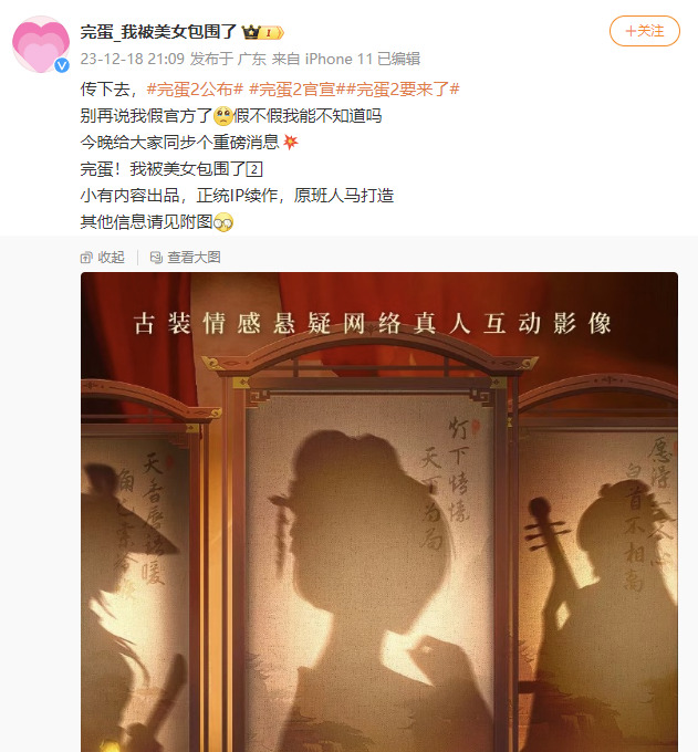 随着影视互动游戏《完蛋!我被美女包围了》之前爆火出圈,其开发者及游戏演员的动向都受到了广泛关注。今天,《完蛋!我被美女包围了》官方微博在游戏上线仅两个月后便公布了续作计划。